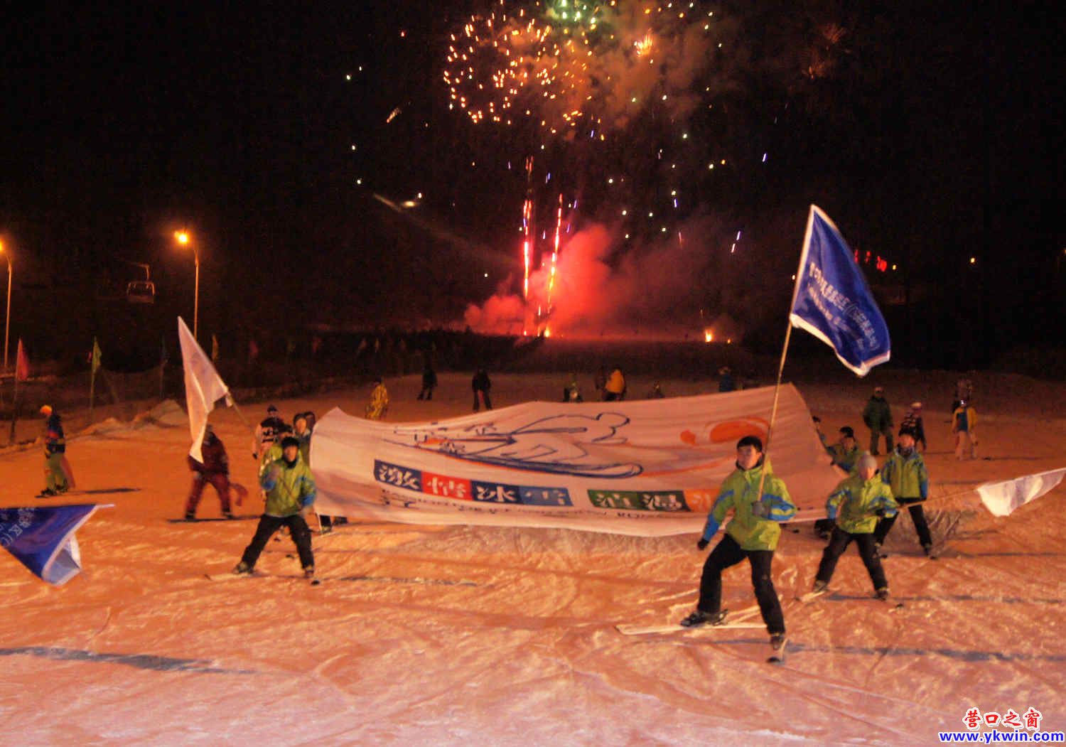 1月8日16时58分,营口鲅鱼圈何家沟风景旅游区滑雪场灯火辉煌,在20米大型雪雕背景的开幕式现场,聚集了来自辽宁省各地旅游局领导,省内外主流媒体记者,省内外旅游商社、滑雪俱乐部、冰雪和温泉旅游企业代表近300人。开幕式由营口市副市长王笑柳主持,营口市人民政府代市长葛乐夫致欢迎词,辽宁省旅游局局长武虹剑与营口市委书记魏小鹏等一同按动开幕式启动球后,顿时锣鼓齐鸣、礼花满天,一群速滑发烧友手持飘带从800米长的高级雪道顶端飘然而下,随即“营口市全民健身千人滑雪活动”也正式开始。