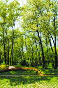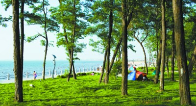 与沙滩形成平行相接的是郁郁葱葱的原始丛林,年代久远,树丛茂盛,掩映在海岸线边,形成独特的绿色景观。这片位于国家森林公园万亩海防林之中的槐树林有50多年树龄,空气清新凉爽,是个天然的大氧吧。曾有部门对槐树林中负氧离子含量做过检测,发现其是城区的五六十倍。
