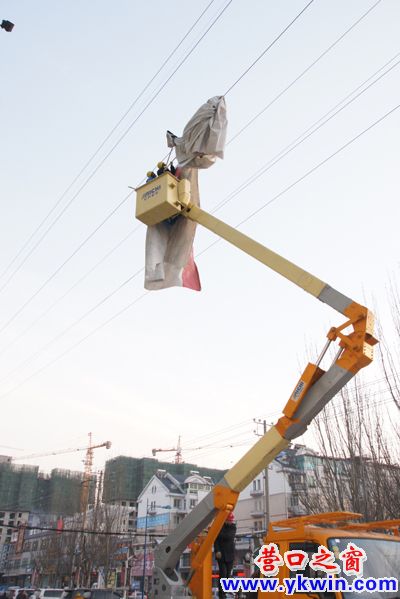 半小时后,一台大型作业车将张凯和另一名技工送到距离高压线只有一米远的位置,两名技工一面用壁纸刀将广告布分解成若干小块,一面用绝缘杆挑举广告布,15分钟后,终于将破损广告布安全取下运送到地面。