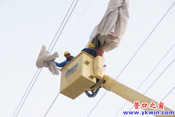 4月13日下午,营口供电公司运检部的工作人员经过三个多小时的抢险,将一块缠绕在66千伏高压线上的破损广告布分解成三块撤到地面。