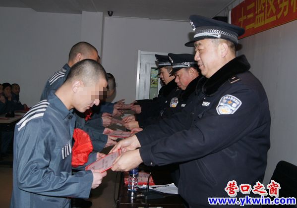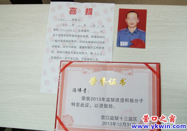 十三监区为获奖的服刑人员统一印制了喜报和荣誉证书,今年监区还安排专人为获奖的人员拍摄了佩戴光荣花的照片,这些照片和喜报及荣誉证书一同分别邮往服刑人员的家中。2013年是服刑人员王军收获最大的一年,他不仅获得了营口监狱改造积极分子称号,还被评为辽宁省改造积极分子,共计可减刑90天。王军的家在黑龙江佳木斯农村,父亲过世,母亲多病,家庭经济非常困难,母亲很少到监狱探望。王军的姐姐探监时告诉他,去年母亲收到他获奖的喜报后,高兴得一夜没合眼。