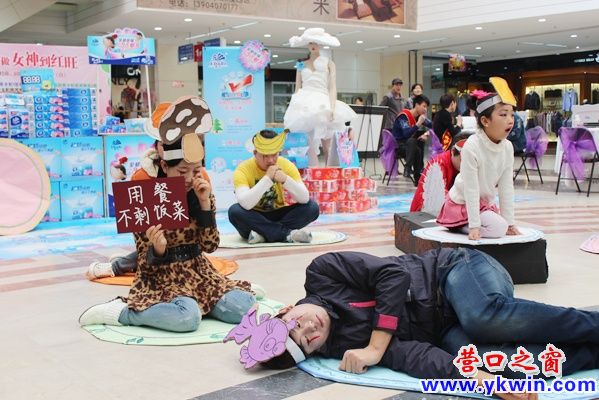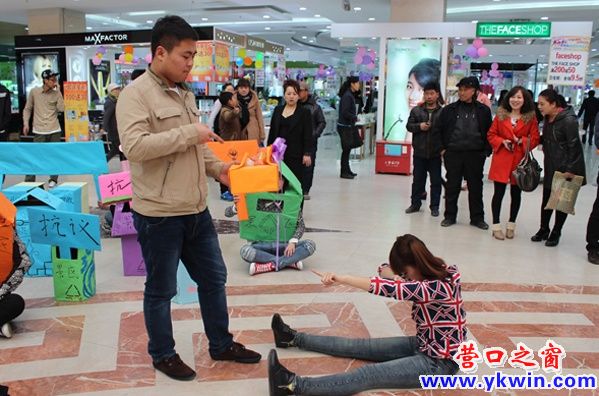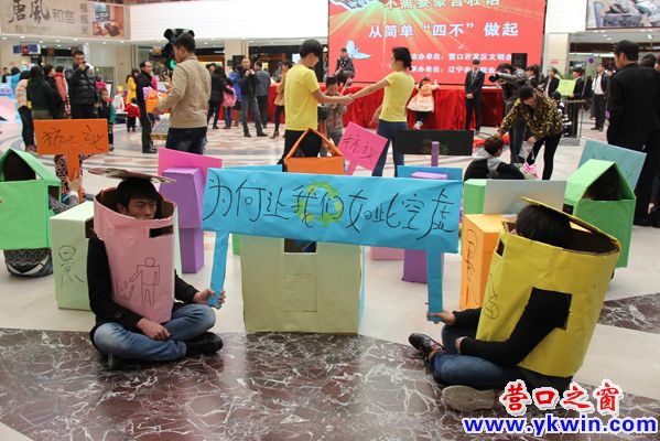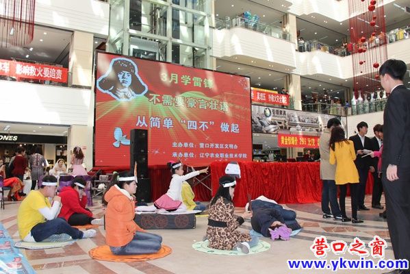 红灯亮起,数十名身穿黑色西服、手拿公文包的市民突然定格、纹丝不动。三十秒静止过后,红灯变绿灯,响起了节奏欢快的音乐,静止的市民随即恢复行动,这一特别场景,吸引了很多行人驻足观看。3月9日,在营口开发区红旺购物广场,数十名大学生用“行为艺术”的形式,倡导“走路不闯红灯、用餐不剩饭菜、上网不说脏话、旅游不扔垃圾”的文明理念。