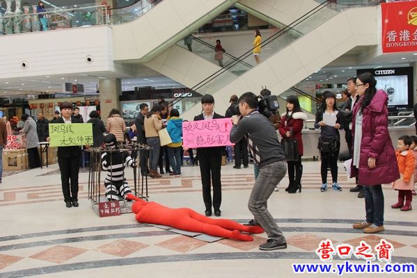 活动现场,学生们有的身穿道具,有的手拿标语,分四组在商场大厅四角,以静止不动的造型艺术表达“四不”主题。
