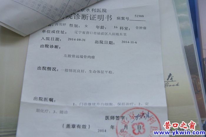 10月中旬,在营口第二高中读高二的女生肖雪婷上体育课跑步时,突然感觉腿部无力,站立不稳,而且伴有剧烈的疼痛感。肖雪婷的父亲起初以为身体微胖的女儿缺乏运动,才感到身体不适。晚上回家,细心的母亲罗静一摸女儿的左腿有很大的一块硬块,感觉有些不对头。第二天夫妻俩带着女儿到营口骨伤科医院就诊。X光片出来,骨伤科全体医生会诊后,立即告诉肖猛夫妻俩,孩子病情严重,赶紧转院进一步确诊、治疗。当天肖猛夫妻俩带着肖雪婷赶到了沈阳某大型医院就诊,医生告知,欲保全孩子性命,必须为孩子左腿做截肢手术。母亲罗静不忍心,和丈夫商量一下,带着孩子辗转来到北京积水潭一家医院就诊。