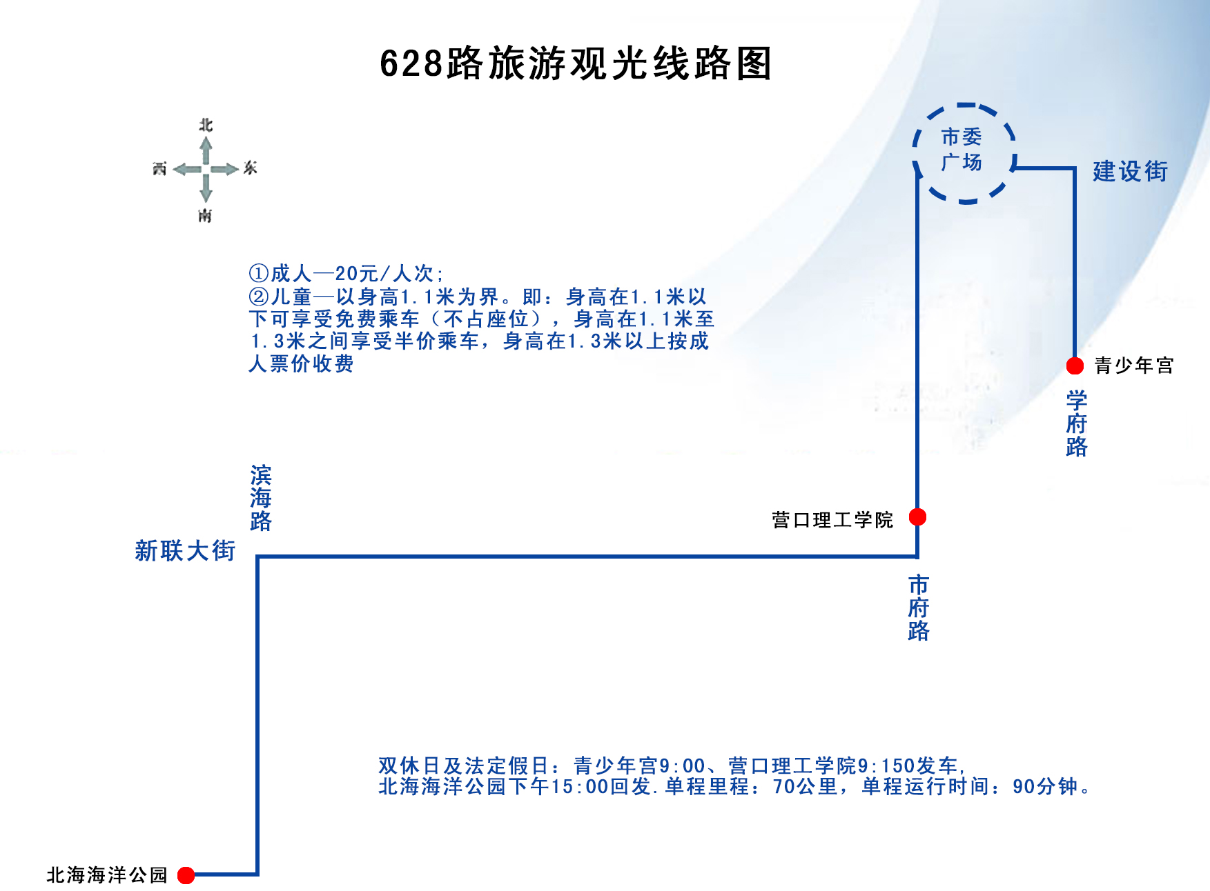 线路走向为青少年宫”(西门)始发,经行学府路、建设街、市府路、博文路、营口理工学院后终点到达北海海洋公园。停靠站点为青少年宫”(西门)、营口理工学院(206路)、北海海洋公园。发车时间为青少年宫(西门):9:00,营口理工学院:9:15,北海海洋公园:15:00。