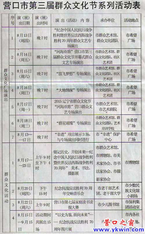 “营口市第三届群众文化节”8月13日至9月15日举办,将开展营口群众文艺专场演出等6场群众文化广场演出。