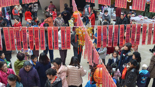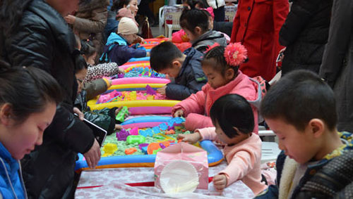 活动现场,节日气氛十足。有几百条灯谜飘带和造型精美别致的灯笼,还有手工摇制的元宵和串起的糖葫芦。“千尺田园、尽在土上,打一字;背着针、满处窜、小货郎、不挑单,打一动物……”孩子和家长们兴高采烈地徜徉在谜海之中,充分调动思维,努力猜出一条又一条灯谜。在礼品登记处孩子们拿着记录好的谜底开心雀跃地兑换着充满童趣的小礼物,欢乐无比。猜谜的同时孩子们还了解了元宵节的来历,亲自体验元宵的摇制过程,DIY做蛋糕、插花,玩沙盘,品尝酸甜的糖葫芦、酥脆的爆米花,观看民间工艺人捏面人的绝活。