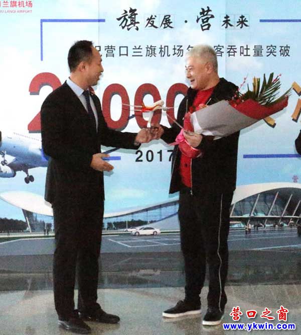 营口机场在候机楼举行了简短的庆祝仪式,营口市政府副秘书长李锡臣、市交通局机场办领导、营口机场董事长段剑锋、副总经理董明军出席了此次活动。现场,营口机场董事长向幸运旅客颁发了礼品。
