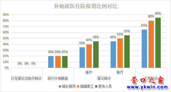 对于参保人患有我市医院不能诊治的疾病需要异地转诊住院的,由参保人申请、市直及各县区中心医院出具转诊手续,可办理异地转诊住院(起付线1000元,报销比例:退休人员85%,在职职工80%,城乡居民65%);对于参保人患病后虽然不符合异地转诊条件,但有意愿去异地住院治疗,持相关诊断证明到医保中心(含分中心)登记备案后,可办理异地登记住院(起付线1500元,报销比例:退休人员55%,在职职工50%,城乡居民45%,需要说明的是省外就医住院报销比例较省内降低10%);对于迁往异地居住、投奔儿女或异地购房、派出工作的符合异地转诊住院条件的参保人,可按规定办理异地居住住院(起付线1000元,报销比例:退休人员85%,在职职工80%,城乡居民65%);对于参保人员外出探亲、旅游或准假外出期间在异地突发危、急、重病符合急诊住院条件的,可按规定办理异地急诊住院(起付线1000元,报销比例:退休人员85%,在职职工80%,城乡居民65%)。