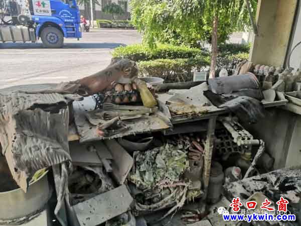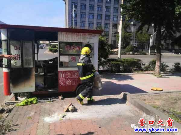 (营口之窗网讯 于娟)6月22日上午8点多,位于营口港区一号大门外突发火情,路边一辆卖煎饼果子的大篷车突然起火,火光冲天。接到报警后,应急保障中心一中队调配一辆消防车、4名消防员立即赶到现场展开救援。当听到周围群众说火场内还有三个液化气罐时,消防员不顾个人安危,在水枪的掩护下冲进火场将三个还在呲呲作响的液化气罐一一拎出,放到空旷安全处,并用水枪给罐体降温,避免了爆炸事故。