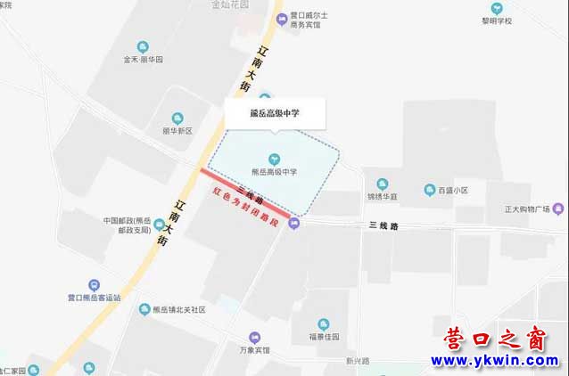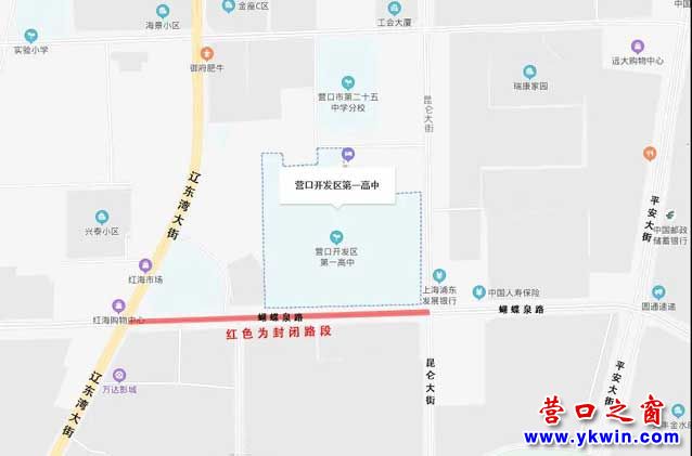 1、营口开发区第一高级中学:蝴蝶泉路从高中岗西行至辽东湾大街红运岗封闭