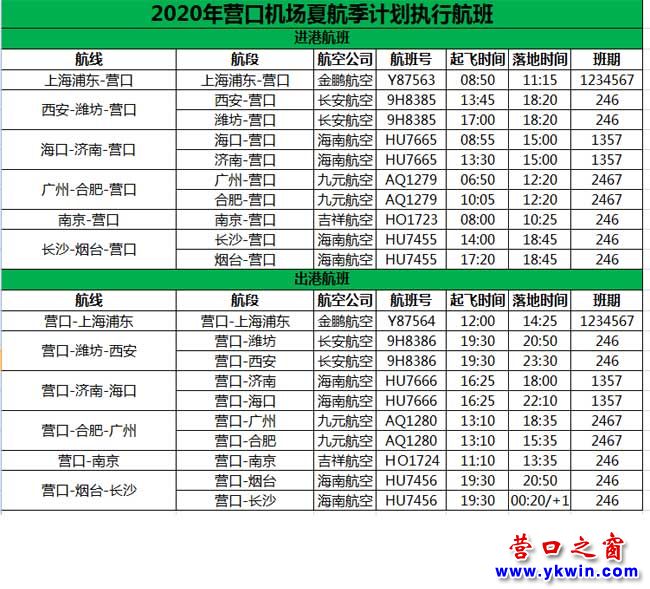 航班时刻:2020年9月8日起,上海浦东-营口 08:50-11:15,营口-上海浦东 12:00-14:25
