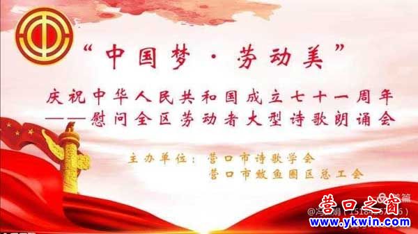 (营口之窗网讯)9月26日上午,为了喜迎国庆,庆祝祖国七十一华诞,并向鲅鱼圈区所有环卫工人致敬。营口市诗歌学会和鲅鱼圈区总工会在鲅鱼圈区工会大厦六楼会议室内联合举办了“中国梦.劳动美”庆祝中华人民共和国成立七十一周年——慰问全区劳动者大型诗歌朗诵会活动。