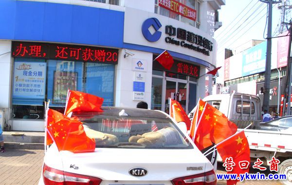 9月28日,营口市大润发超市附近一辆轿车的前面、左面和右面都插上了国旗,总数有二三十面,成为营口街头巷尾插国旗最多的车。别的车一般仅插一面到两面国旗。