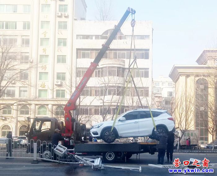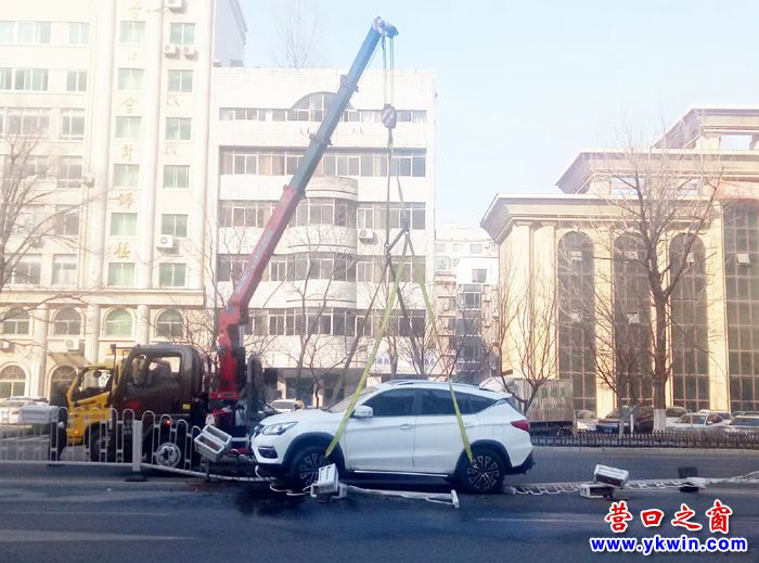 2月16日14时,在营口市中天壹品小区门前渤海大街中间,一辆电动汽车就像一架直升飞机一样徐徐升空。此前,它在这里一不小心撞上了隔离护栏损坏,此刻,它正被闻讯赶来的吊车装上救援拖车以便送往4s店维修。