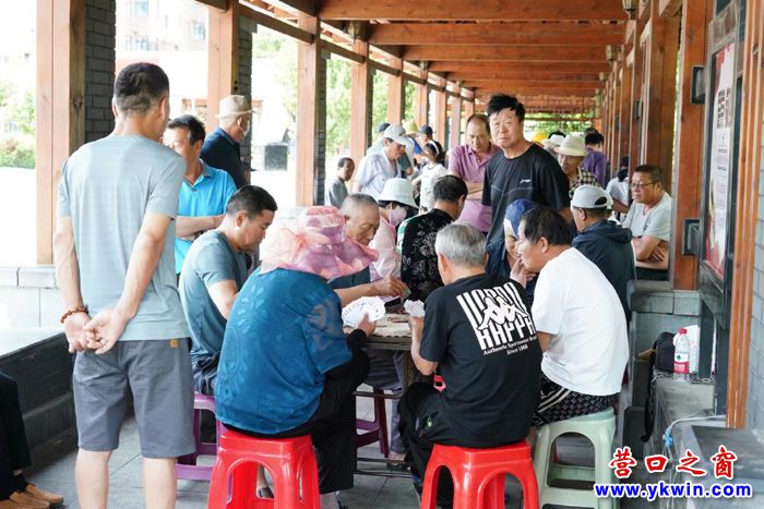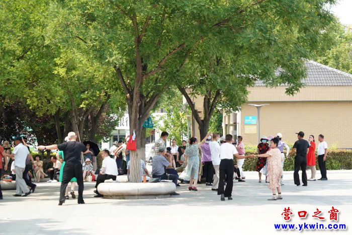 在广场的树荫旁,一些大妈穿着艳丽漂亮的服装,手持彩扇,舞起欢乐的东北大秧歌,在广场的北部长廊里,一些大爷大妈围成一圈,下像棋,打扑克,“杀声正酣”。