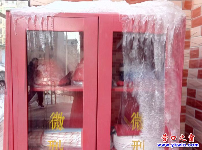 12月27日,因房顶积雪融化滴水结冰,致使摆放在营口市跃进办事处振华社区办公楼墙边的微型消防站被冰坨封门。这意味着遇有火警无法拿出里面的灭火器等消防器材。
