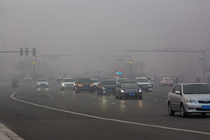 清晨的街道本该是车水马龙,此刻却像被按下了慢放键。道路上的汽车都龟速挪动着,车头的雾灯射出昏黄的光,连光线都无法穿透这浓稠的雾气,留下一团模糊的光晕。车灯与路灯的光交融在一起。