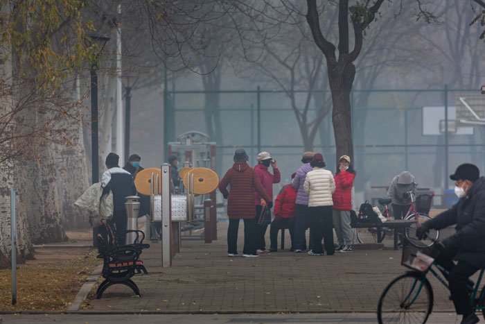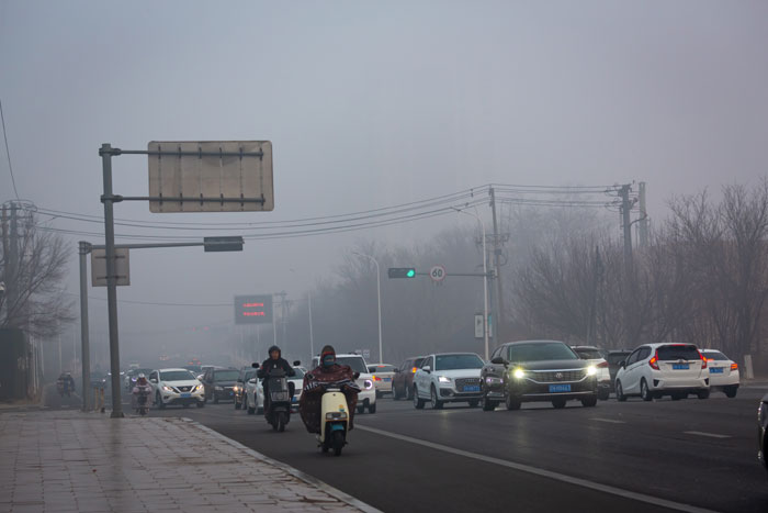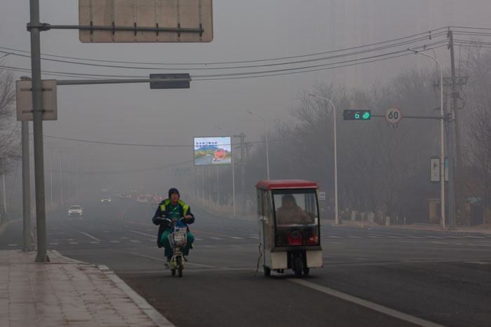 行人脚步匆匆却又小心翼翼。走到十米开外,就变成了一个模糊的灰色轮廓,身后的建筑更是彻底隐没在雾里,只留下淡淡的、若有若无的黑影,但人们似乎并不惊慌,依然有序生活。
