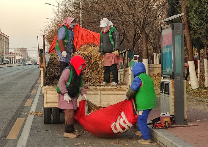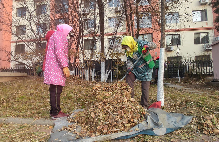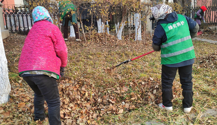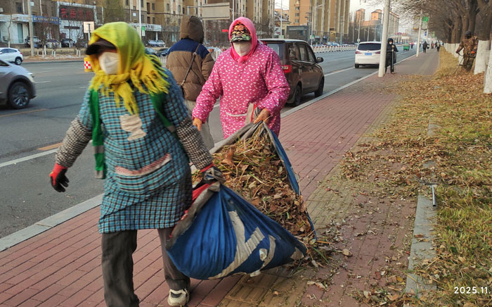 11月26日清晨,营口市青花大街南湖段一群绿化养护工人冒着寒风在街道旁绿化带草地上忙碌着。她们用钯子将枯黄的落叶聚拢,放入大片布兜着,然后两人合作兜着落叶,堆放到绿化养护卡车上。男养护工则手持工具在梳理草坪。他们的身影在晨光里,为初冬的绿化带维护着整洁,用双手在落叶与泥土间,书写着城市绿化的日常坚守,在寒风中书写着属于劳动者的责任与担当,是这座城市冬日里最温暖的风景。
