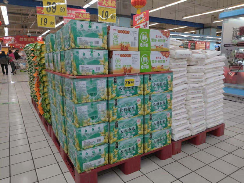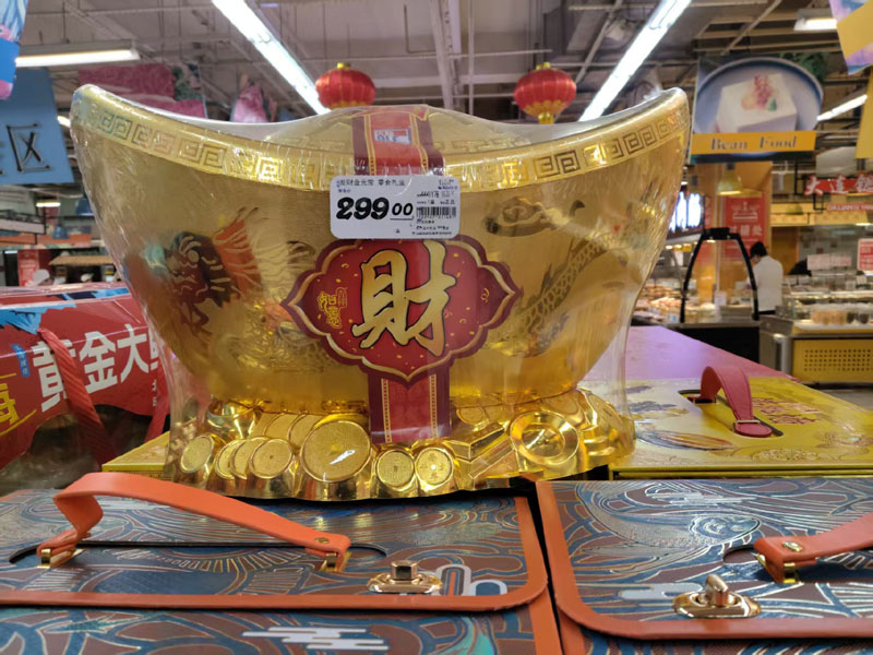 1月23日,进入营口市一家大超市,首先映入眼帘的是一座百余米的年货长城。走近一看,砌筑长城的“砖”有包装精美的米面油、酒水、鲜奶和糖果等,而长城末尾是一个特大的“金元宝”。