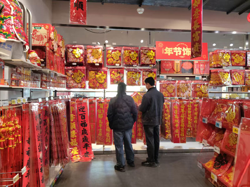 另外,在百米年货长城的东边还有一片区域悬挂着精神年货春联和福字等。在现场,一些市民已经开始挑选马年的春联和福字了。其中一副马年春联是这样写的:马年如意迎富贵/佳节平安纳吉祥。