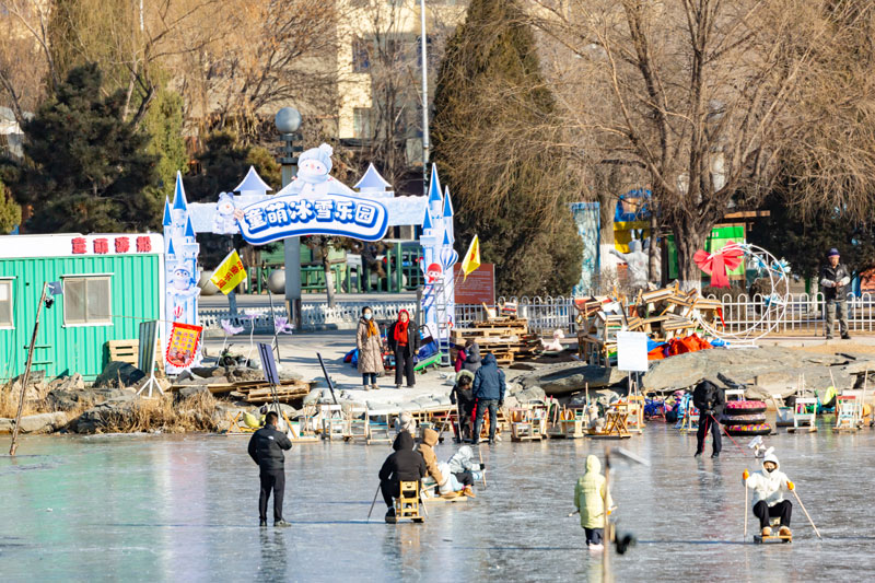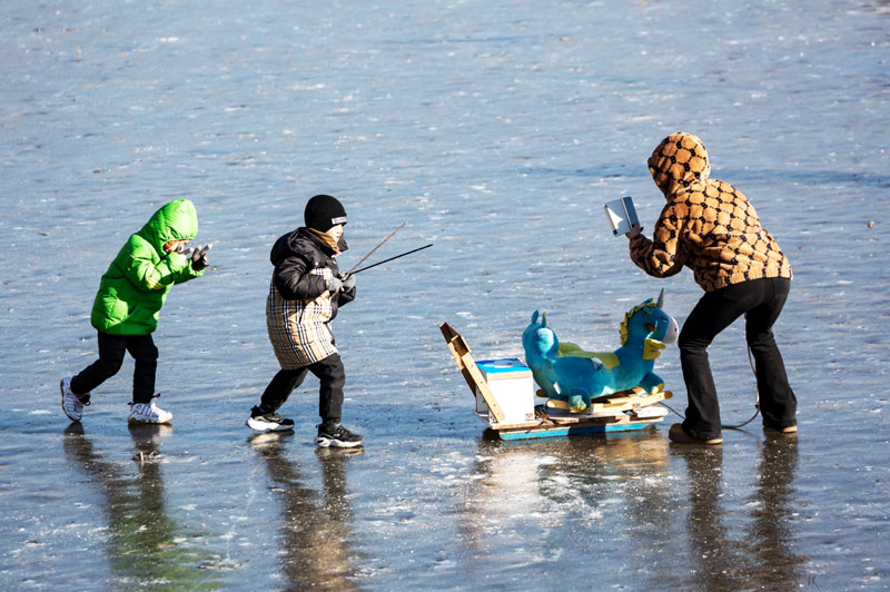 冰面周围的雪地上,也站着不少赏景的游人,看着冰面上的热闹,时不时惊起几声轻笑。冷冽的冬日里,镜湖公园的冰面之上,有成年人锻炼的畅快,有孩童玩耍的天真,有家长陪伴的温情,声声笑语融在冬日的空气里,让这片冰封的湖面,成了冬日里最温暖、最有生机的角落。