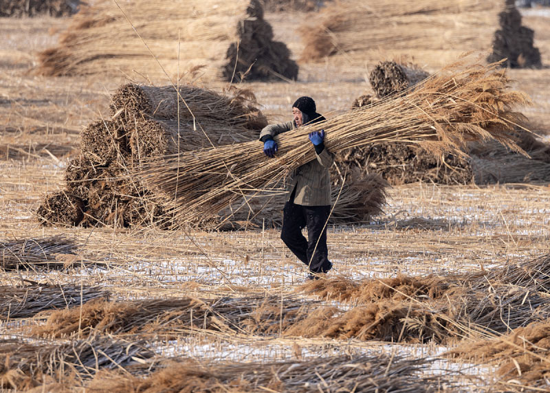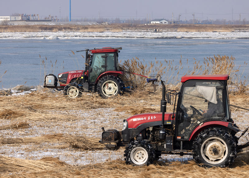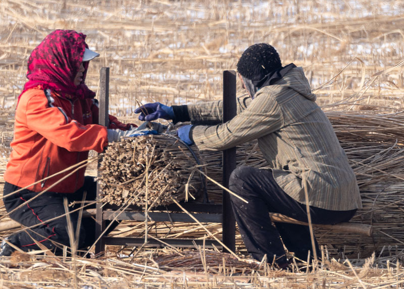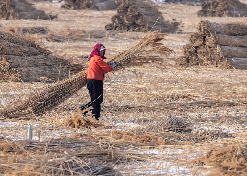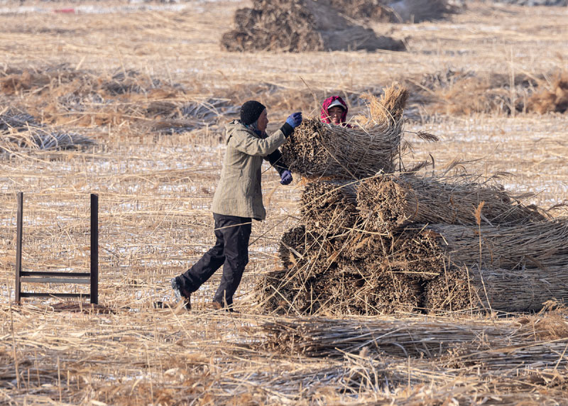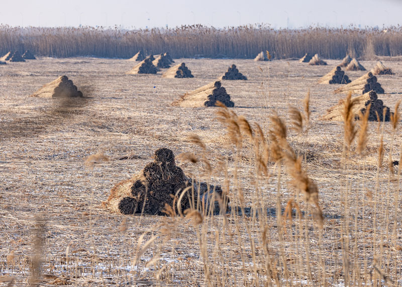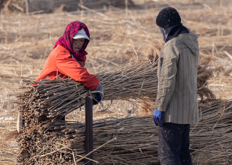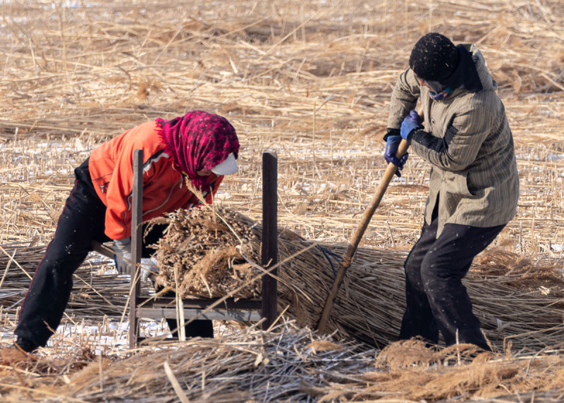 辽河入海口永远角湿地一带的芦苇开始收割了。昨天路经这里看到割苇机正在作业。割苇机所到之处芦苇立刻“躺平”,效率极高。随后人工将散在地上的芦苇收拢起来,放在框架上捆扎成一捆一捆,然后堆成垛待运。据说这样成捆扎起来的芦苇做为原料产效高,散落在地上的零碎芦苇用机械收拢后直接打成包。看到寒天里捆扎芦苇作业的人很辛苦,累了便席地而坐,渴了、饿了就填巴几口随身带的水和干粮。生活就是这样,多有不易。