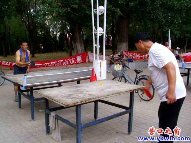 营口泰和园公园的乒乓球运动十分活跃,以致乒乓球案都不够用了。8月11日,其中一个乒乓球案的一半缺失了四分之一形成了一条“楚河”还照样有人在打乒乓球,这个有“楚河”的乒乓球案目前已成泰和园公园的一怪。