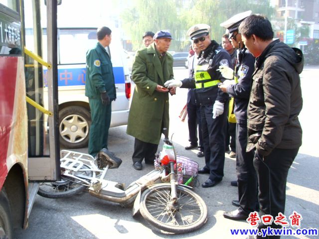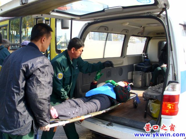 10月22日近11点,在营口金牛山大街上,一对老两口1+1骑乘(老头载老婆)电动车自东向西行至盼盼路口时,被一辆自北向西拐的11路(育新小区——大商新玛特)公交车撞到了尾部摔倒,老头安然无恙站起,老婆却站不起来了。随后,老婆被抬上120急救车送往医院救治。