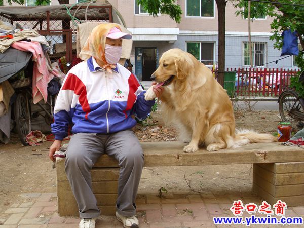 这只大黄狗和主人形影不离,主人坐在长凳上,它也坐在长凳上。在这个长凳上,这只大黄狗和主人可谓平起平坐,没有半点不好意思。5月31日摄。