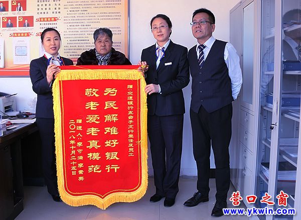 10月31日中午,营口交通银行得胜(五台子)支行,72岁的李素英老人手持一面印有“为民解难好银行 敬老爱老真模范”金色大字的锦旗送到支行,由衷感谢支行领导及员工认真负责、热情真诚、高效便民的优质服务。